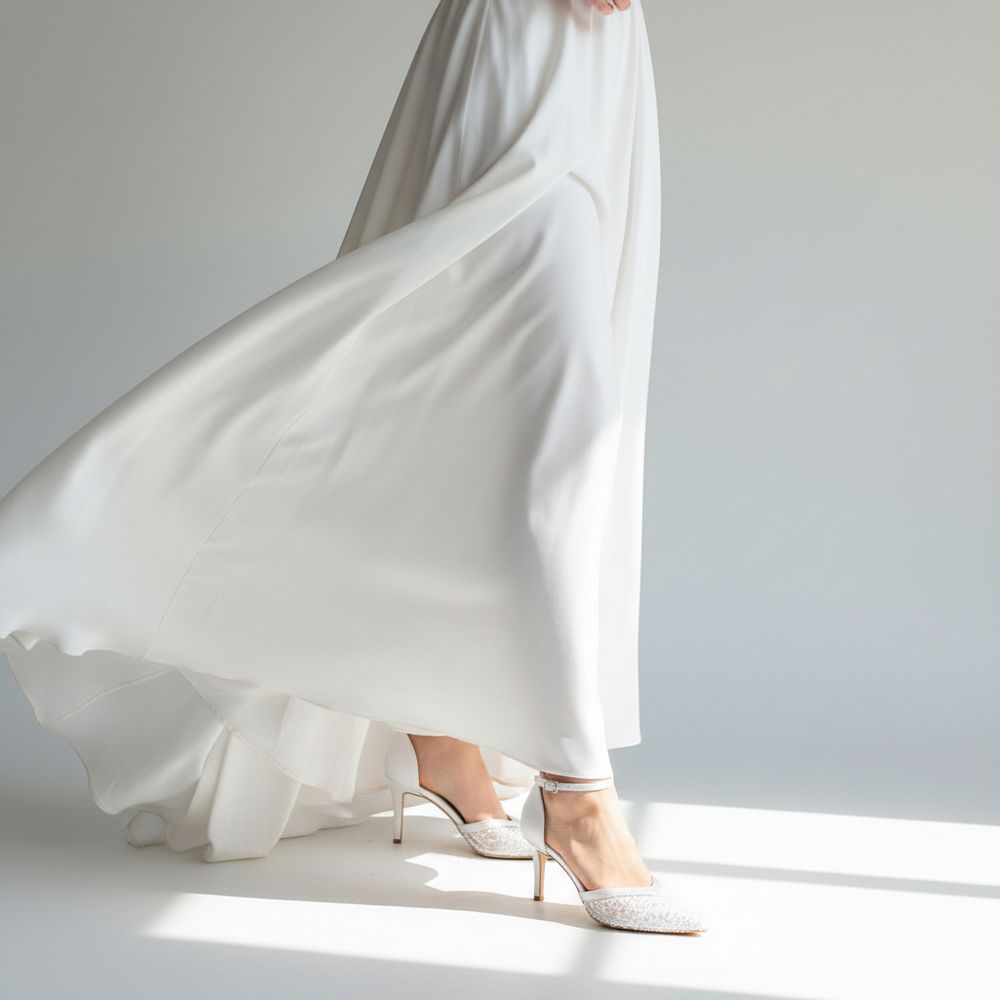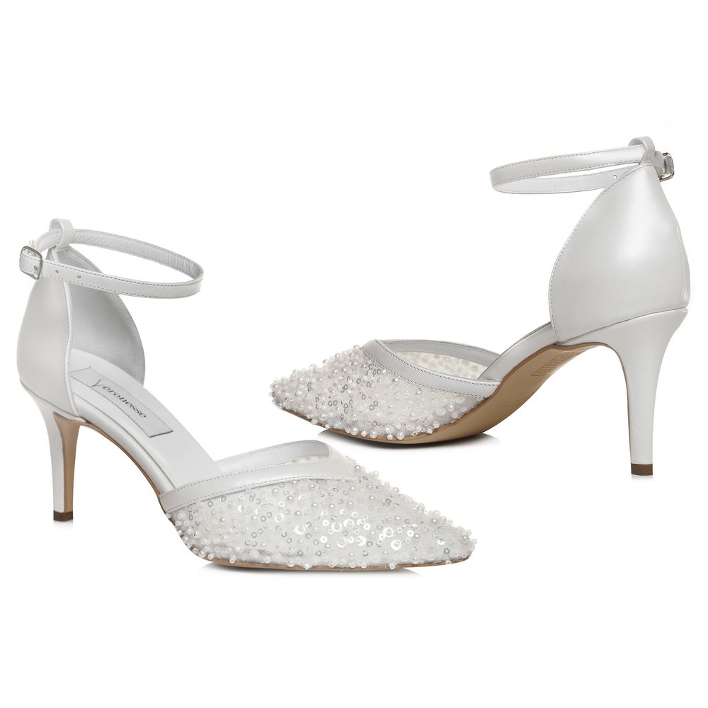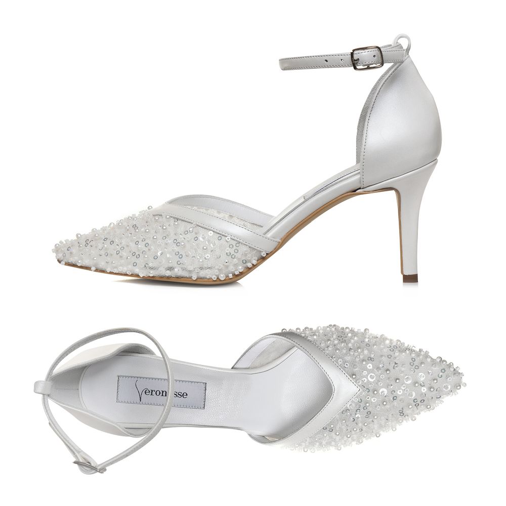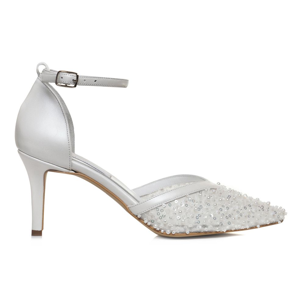 Pantofii Celia sunt creați pentru apariții elegante și rafinate, fiind realizați din piele naturală albă și completați de un detaliu frontal din dantelă fină, decorată cu perle. Designul cu vârf ascuțit și baretă subțire la gleznă oferă un echilibru armonios între delicatețe și structură, potrivit pentru ținute de mireasă sau evenimente speciale.