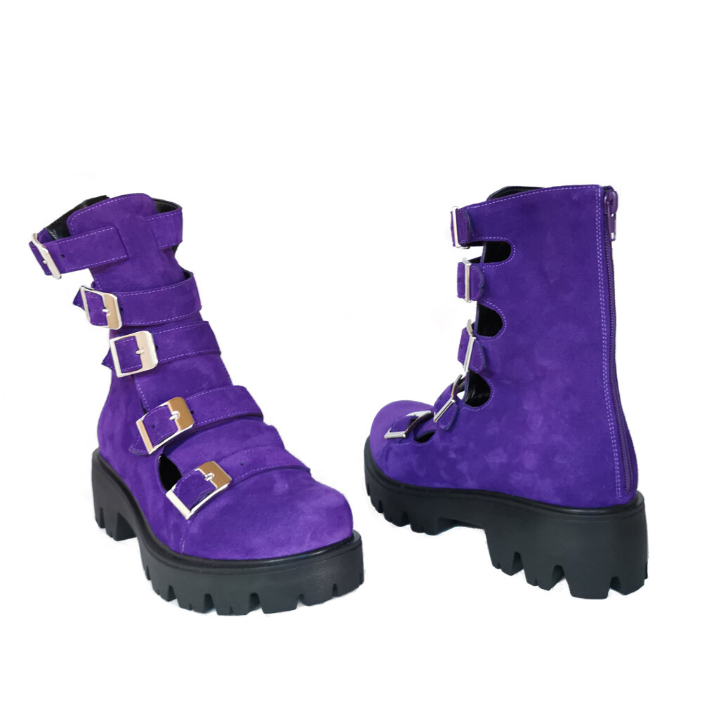 Bocanci pentru primăvară cu decupaje și catarame, cu talpă masivă. Această pereche de bocanci este realizată din piele naturală, cu decupaje care permit piciorului sa respire. Cataramele argintii dau un plus de strălucire. Ideali pentru zilele calde de primăvară sau pentru serile răcoroase de vară. Se pot asorta cu o pereche de pantaloni casual sau o rochie vaporoasă și o geacă de piele.